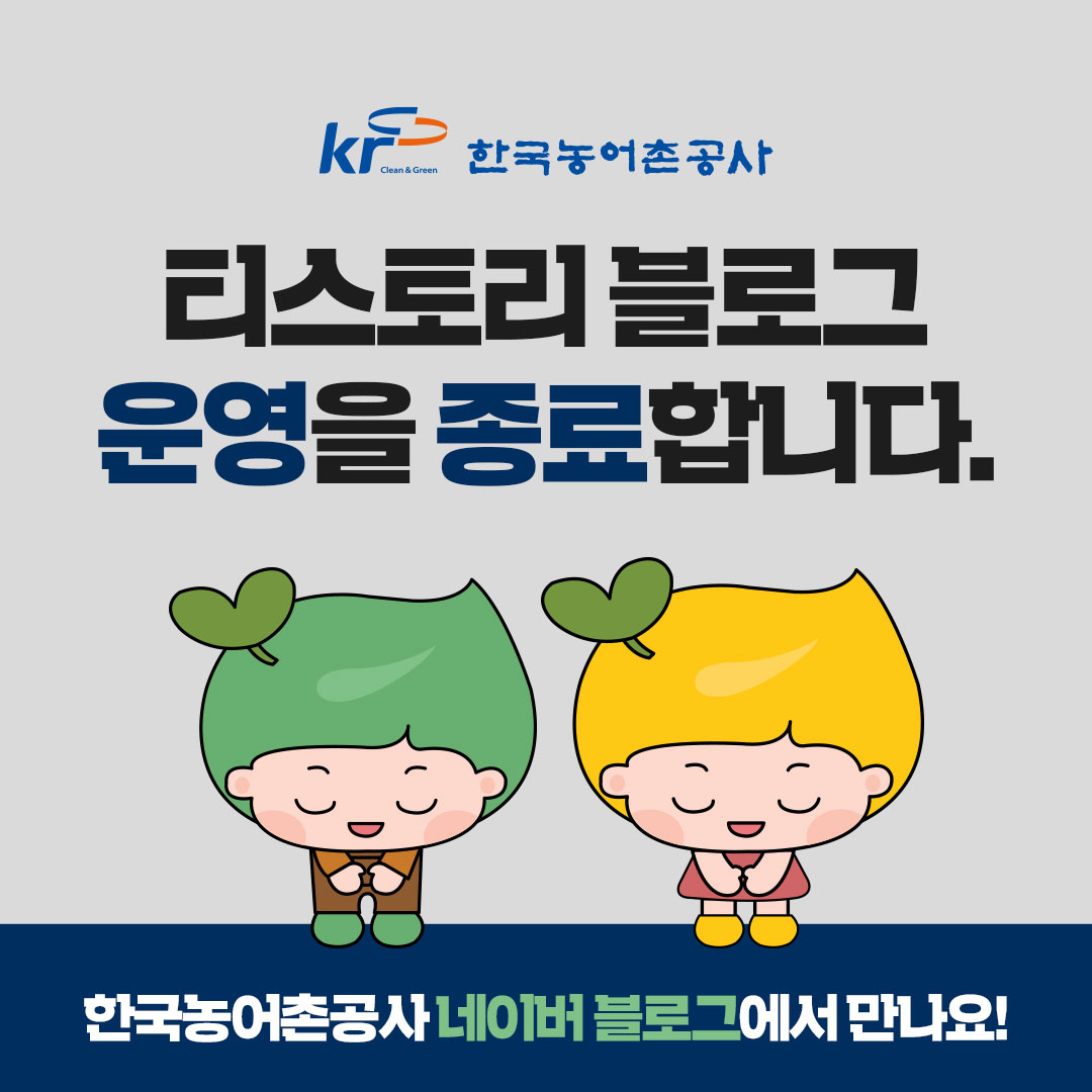 안녕하세요. 먼저 한국농어촌공사 티스토리를 사랑해주신 여러분들께 감사의 인사를 전합니다. 효율적인 운영을 위해 2023년 12월 31일자로 티스토리 운영을 종료하게 되었음을 전해드립니다. 티스토리에서 만나보셨던 콘텐츠들은 모두 네이버 블로그(blog.naver.com/krcpolicy)에서 만나볼 수 있습니다. 그동안 티스토리를 방문해주신 여러분께 진심으로 감사드리며, 네이버 블로그를 통해 더 나은 콘텐츠와 소식으로 찾아뵙도록 하겠습니다. 감사합니다. 🖥️ 한국농어촌공사 네이버 블로그 바로가기 https://blog.naver.com/krcpolicy