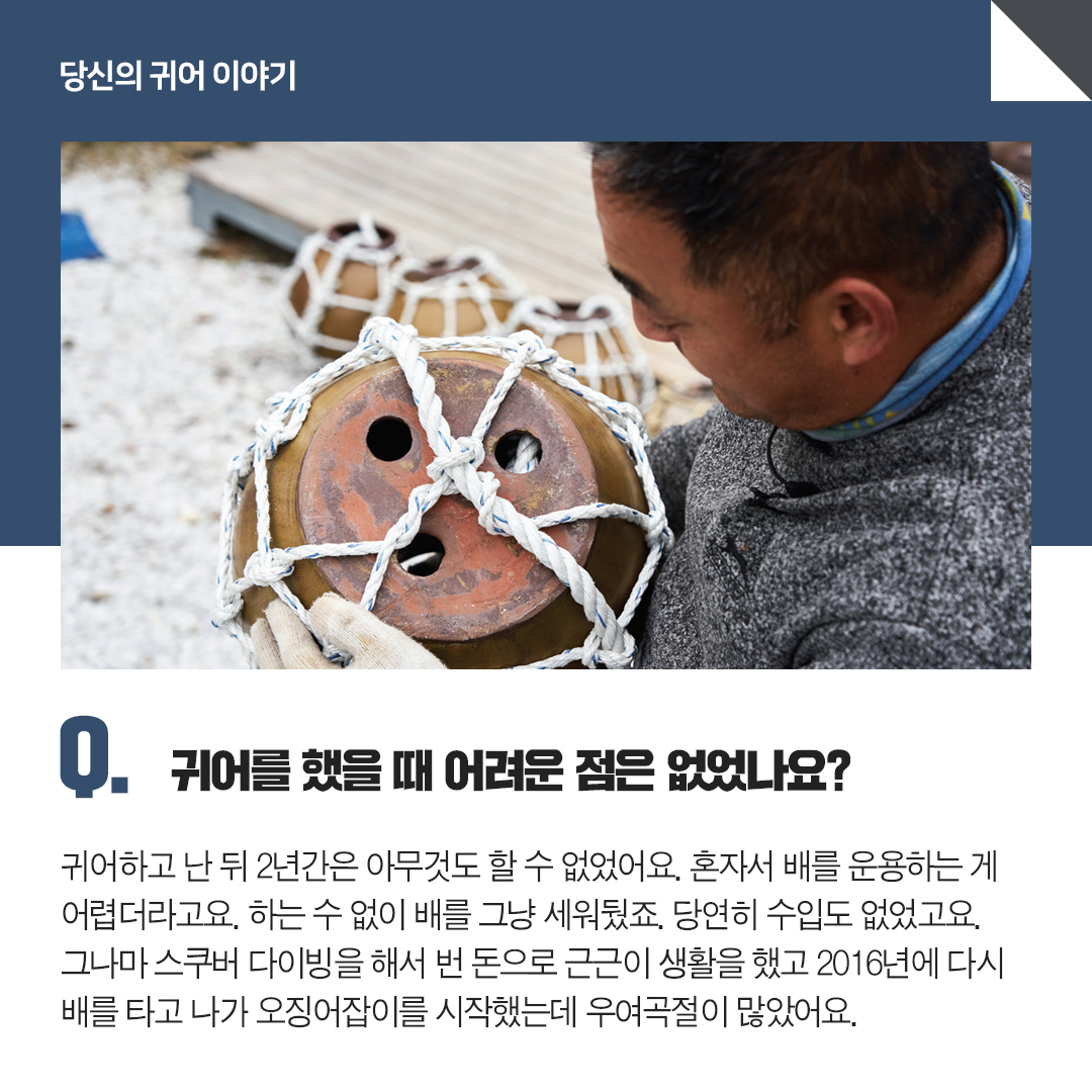 귀어하고 난 뒤 2년간은 아무것도 할 수 없었어요. 혼자서 배를 운용하는 게 어렵더라고요.