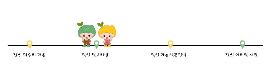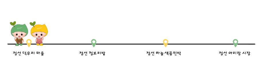 1. 정선 덕우리 마을 → 2. 정선 청보리밭 → 3. 정선 하늘색꿈민박 → 4. 정선 아리랑 시장