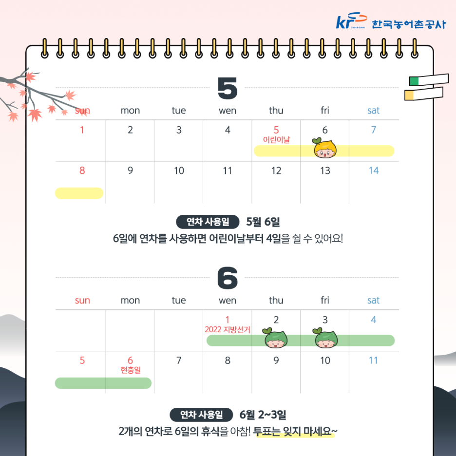 6월에는 2022 지방선거와 현충일이 있는 달입니다. 6월 2일과 3일, 두 개만 쓰면 6일의 휴식을 취할 수 있는데요. 이때, 투표는 꼭 해야 한다는 점 명심해 주세요?