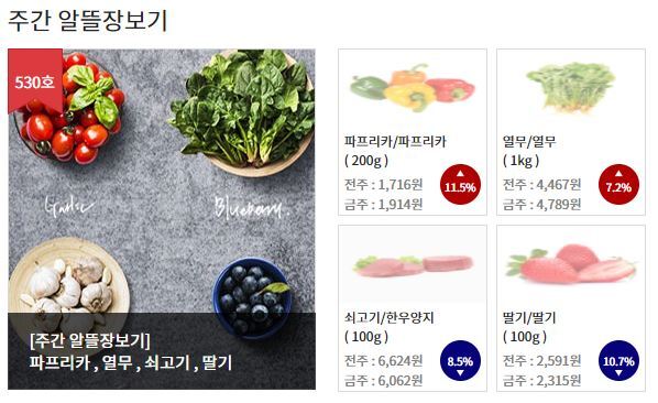 특히 주간알뜰장보기를 활용하면 좋은데요. 이번 주는 파프리카와 열무 가격이 올랐고, 쇠고기와 딸기의 가격이 내려갔네요! 그럼, 쇠고기와 딸기로 배부르게 장바구니를 채울 수 있겠죠? :-)