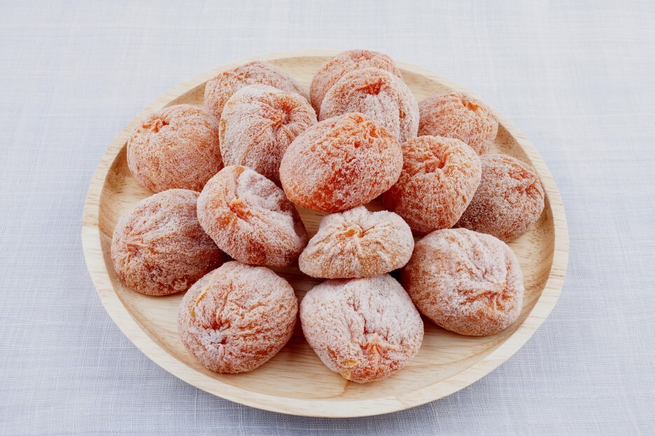 과육이 딱딱하거나 물렁하고, 탁한 주황색을 띠며, 네모난 모양으로 깎여 있습니다.