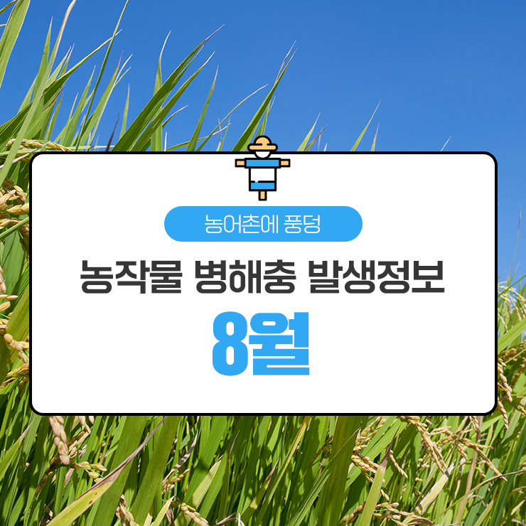 병해충 피해를 받지 않기 위해서는 미리 알아두어야 도움이 되겠죠? 농업에 종사하시는 분들은 특히 집중해 주세요! 알아두면 쓸모 있는 <농작물 병해충 발생정보 8월>로 만나보아요 :)