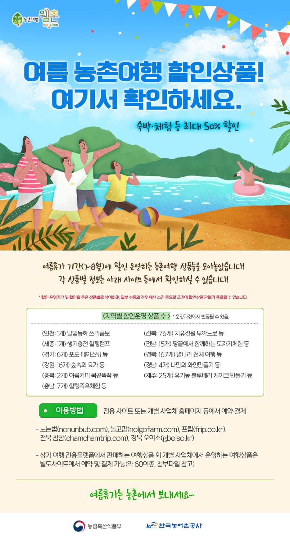 여름휴가 기간(7~8월)에 할인 운영하는 농촌여행 상품들을 모아놓았습니다!