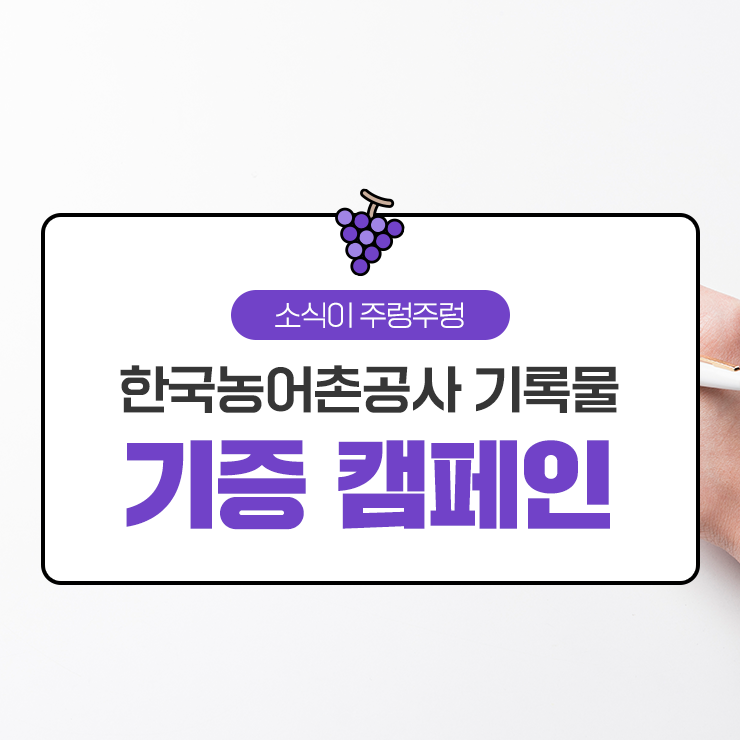 한국농어촌공사 기록물 기증 캠페인 2022. 11. 1. ~ 11. 29. 수집대상 수리조합 시기부터 현재까지 한국농어촌공사의 역사와 주요업무 관련된 모든 형태의 기록물 수집유형 종이문서, 대장류, 시청각물, 간행물, 도면, 카드, 구술자료, 디지털 자료 등 기증조건 무상기증 신청방법 방문·우편·전자우편을 통해 기증신청서 제출 ※한국농어촌공사 홈페이지에서 다운로드 (사이버 홍보▶알림마당▶공지사항) ① 방문접수_한국농어촌공사 본사 총무인사처 우혜원 ② 우편접수_(58327) 전남 나주시 그린로 20 ③ 전자우편_2180429@ekr.or.kr 기증자 예우 기증에 대한 감사장 및 감사 선물 증정 활용계획 기증기록물은 보존처리 후 온오프라인 전시 등을 통해 활용 예정 유의사항 기증기록물의 소유권은 신청자 본인..