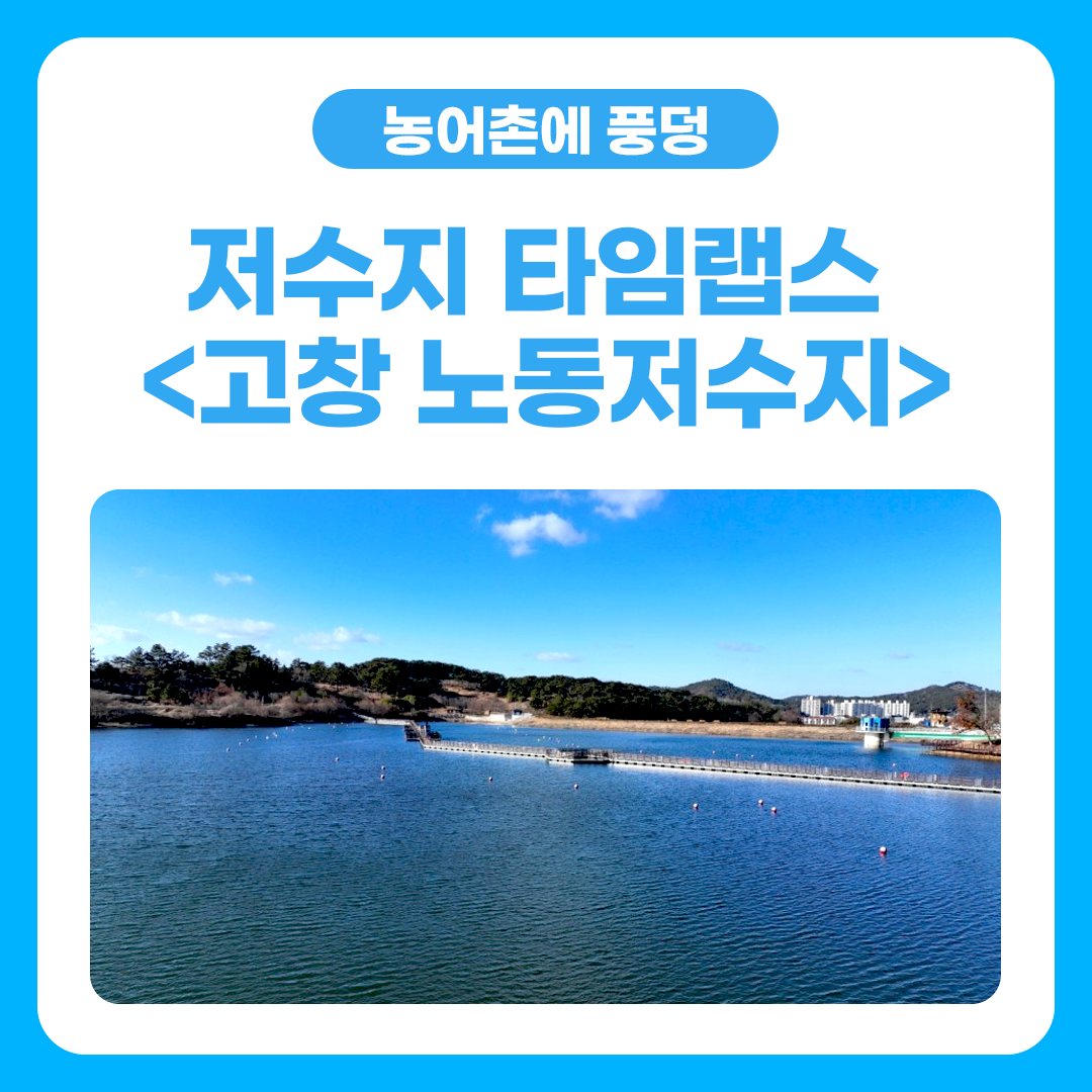 [농어촌에 풍덩💦] 저수지의 잔잔한 물결로 힐링하는 '고창 노동저수지' 고창 노동저수지 타임랩스 고창 노동저수지는 푸른 물빛과 고창읍성 자락의수려한 자연🌲 및 풍광🌞은 조화를 이루며 힐링하기에 더할 나위없이 좋은 장소입니다. 더불어, 다리를 건너면 고창 자연마당 숲체험원도 있어 많은 볼거리까지 있으니 고창 노동저수지에서 여유롭게 산책해보세요~ 그럼 타임랩스 속 시원하게 트인 저수지를 보며 지친 마음을 힐링🍃하러 함께 떠나볼까요? 농어촌에 풍덩 2023.08.02