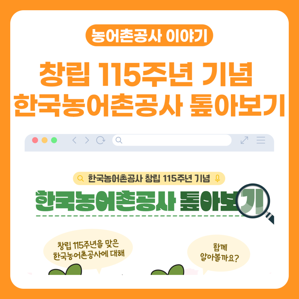 창립 115주념 기념 한국농어촌공사 톺아보기 다가오는 12월 8일은 한국농어촌공사가 설립된지 115주년이 되는 날입니다. 100년이 넘은 유구한 역사를 가진 한국농어촌공사 100년이 넘는 시간동안 한국농어촌공사는 농어촌을 위해 어떻게 발전해왔는지 함께 알아보실까요? 한국농어촌공사의 시초, 전북 옥구서부수리조합 한국농어촌공사는 대한제국 순종 2년인 1908년에 설립된 전북 옥구서부수리조합이 효시입니다. 전북 옥구수리조합은 그전까지 이어져온 관습적인 수리공동체를 대신하는 최초의 법적 조직이었고, 근대적 수리제도의 시작이라는 역사적 의미가 있습니다. 한국농어촌공사는 대한민국 주곡 자급 역사와 함께 발전해왔습니다. 개발·간척을 통해 농지를 확보하고 농업용수개발 사업을 ..