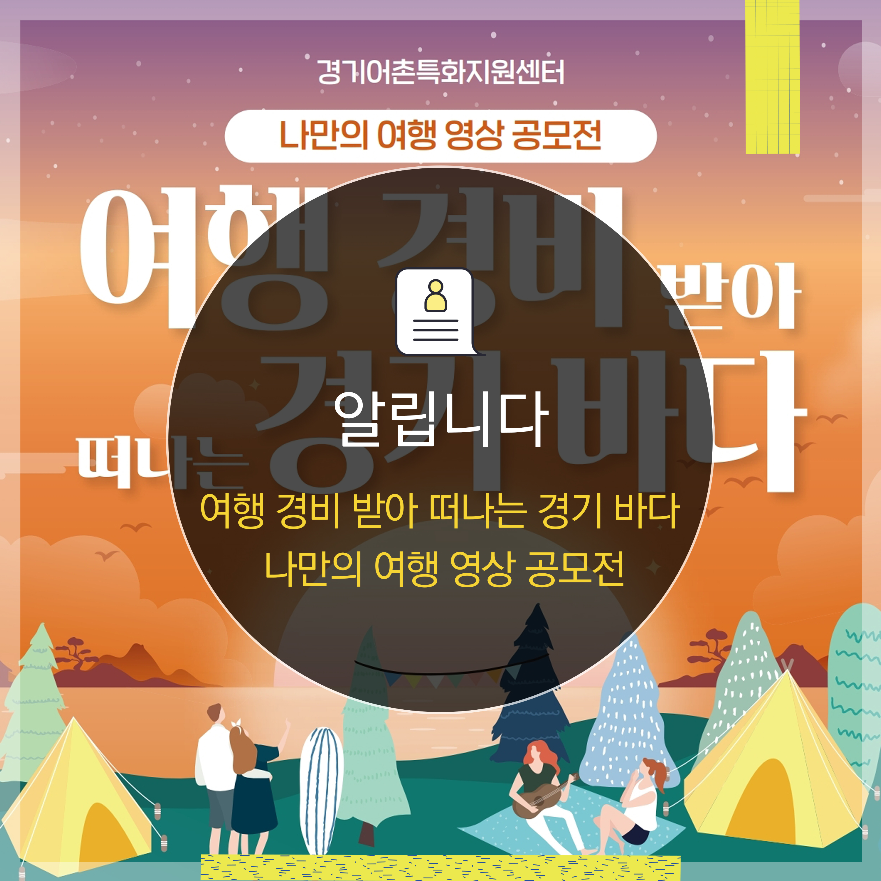 · 경기어촌특화지원센터 · 나만의 여행 영상 공모전 여행 경비 받아 떠나는 경기 바다 · 공모주제 · 경기도내 어촌체험마을을 배경으로 한 나만의 여행코스 V-log 영상 · 참가자격 · 여행을 좋아하는 누구나(개인 및 팀 구성) · 접수방법 · 한국농어촌공사 홈페이지(QR코드) 접속 → 기획안 다운로드 → 이메일 접수(ggbada2021@naver.com) ▼ 참가 신청서 및 기획안 양식 다운로드 받기 ▼ · 영상 · 3분 이상 10분 이내 자유로운 형식의 여행 V-log / 1920*1080 FHD 이상 · 문의 · 경기어촌특화지원센터 ☎02)712-3511 · 지원 및 시상금 · ※소득세법 시행령 87조 및 소득세법 84조에 따라 위의 시상금에서 세금을 제외하고 지급 구분 개인(또는 팀) 시상 대상 ..