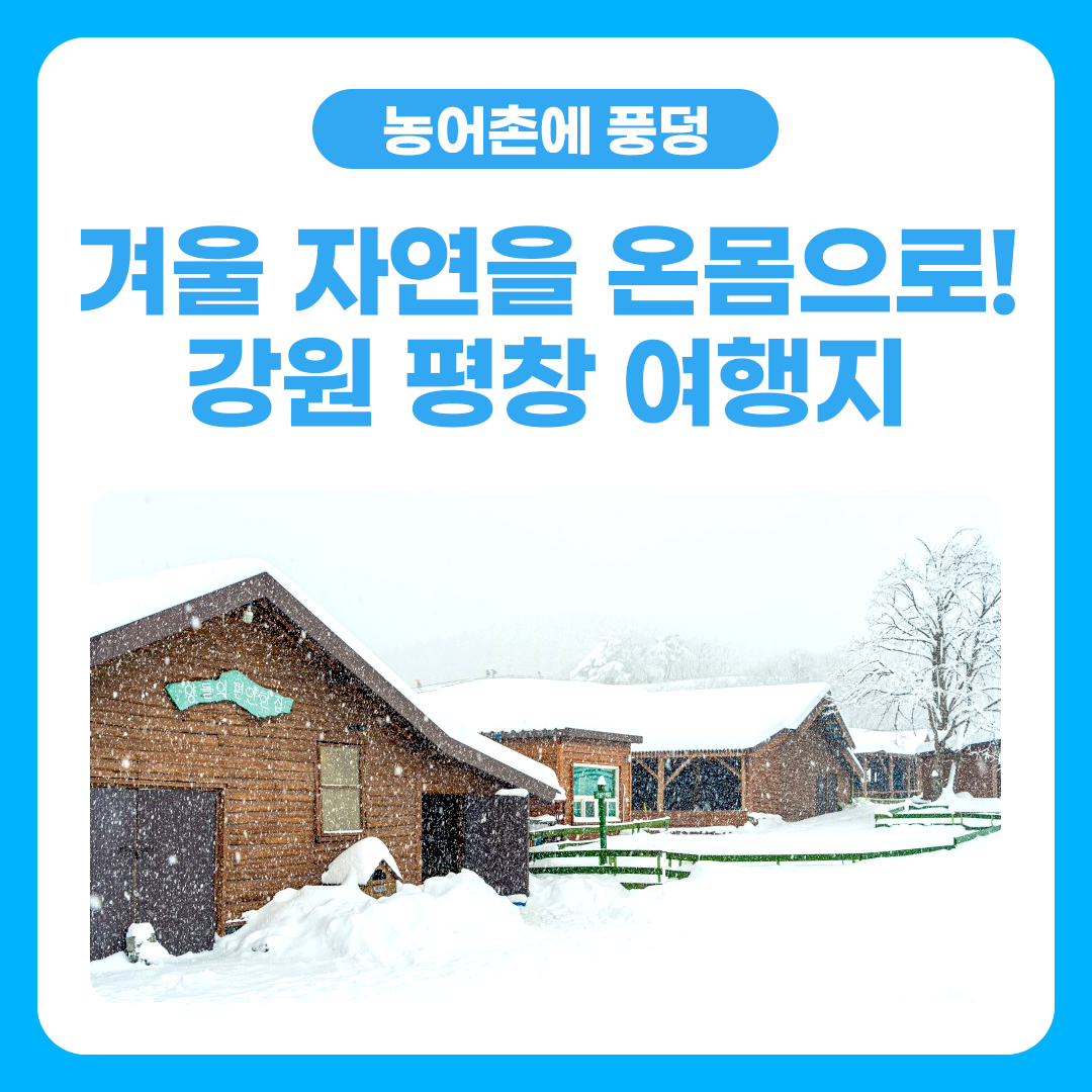 겨울 자연을 온 몸으로 느낄 수 있는 곳! 강원 평창 여행지를 소개합니다 어느덧 매서운 바람과 함께 눈이 내리는 겨울이 찾아왔습니다. 여러분은 겨울을 어떻게 보내고 계시나요? 오늘은 겨울 여행지로 적합한 강원도 평창의 여행지를 소개해 드리겠습니다 :) 1. 대관령 양떼목장 첫 번째로 소개해드릴 겨울 여행지 스팟은 겨울엔 한국의 알프스라고 불리는 대관령 양떼목장입니다. 봄, 여름, 가을에는 푸릇푸릇하고 싱그러운 풀들이 자라나는 대관령 양떼목장도 겨울이 되면 보송보송한 눈이 쌓여 아름다운 겨울왕국으로 변신하는데요 :) 귀여운 양들과 함께 한국의 알프스를 보러 대관령 양떼목장으로 떠나보시는 것은 어떠신가요? 2. 알펜시아 스키점프센터 다음으로 소개해드릴 여행지는 알펜시아 스키점프센터입니다. 겨울하면 스키장! ..